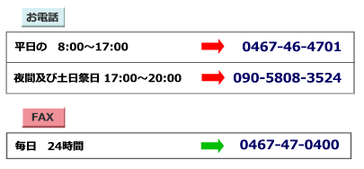お急ぎの場合は、お電話でお問い合わせください。 FAXやメールの場合 は、翌日以降の対応となる場合があります。